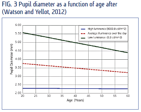 With presbyopia, progressive lenses are required to sustain accomodation over a range of distances. However, accommodation is not the only visual response that changes with age. The pupillary light reflex is the pupil’s response to light. The pupil constricts in light and dilates in the absence of light. The ability of the pupil to constrict is limited by basediameter, which is relative to its ability to dilate. The dilation response decreases with age resulting in average pupil size to reduction. Fig. 3 shows one set of data for two levels of illumination, according to Watson and Yellot.