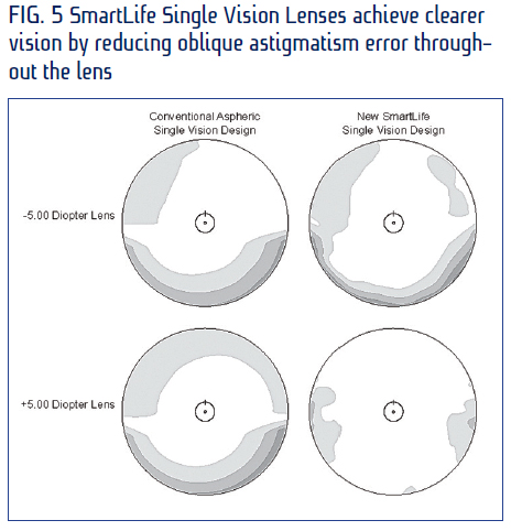 Fig. 5 shows a significant improvement in the clarity of the visual fields of SmartLife Single Vision Lenses compared to standard single vision designs. A complete analysis of Smart Life Single Vision Lenses over a range of prescriptions and viewing distances revealed improved optical performance with up to 88 percent larger clear fields of view.