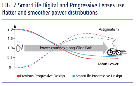 The pattern of eye movements of a digitally connected lifestyle requires rethinking the opti cal design of digital and progressive lenses. Dynamic connectivity leads to spectacle lenses being used for complex and dynamic activities. Therefore, the new power distributions need to be smoother and flatter. Fig. 7 shows an example of the smoother visual glide path in a SmartLife Progressive Lens compared to its predecessor.