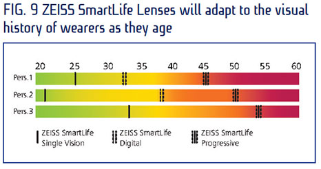 In an external acceptance study among participants who live a connected lifestyle, SmartLife Lenses gave 84 percent of single vision, digital and progressive lens wearers all-day visual comfort (ZEISS Study 4). In this study, 94 percent of SmartLife Single Vision wearers perceived wide fields of comfortable vision for intermediate and near vision tasks. Seventythree percent of SmartLife Digital Lens wearers reported feeling no strain at the end of the day, and the majority reported feeling less eyestrain compared to their habitual lenses. Four out of five SmartLife Progressive wearers experienced smooth vision from near to far across all viewing zones. Although ZEISS provides general guidance for the use of SmartLife Lenses, it is the eyecare professional who is best able to judge when it is time for any person to take the next step in lens type. Fig. 8 illustrates a life timeline that might be applied to any individual. In the early years, a person may or may not have a significant need for vision correction.