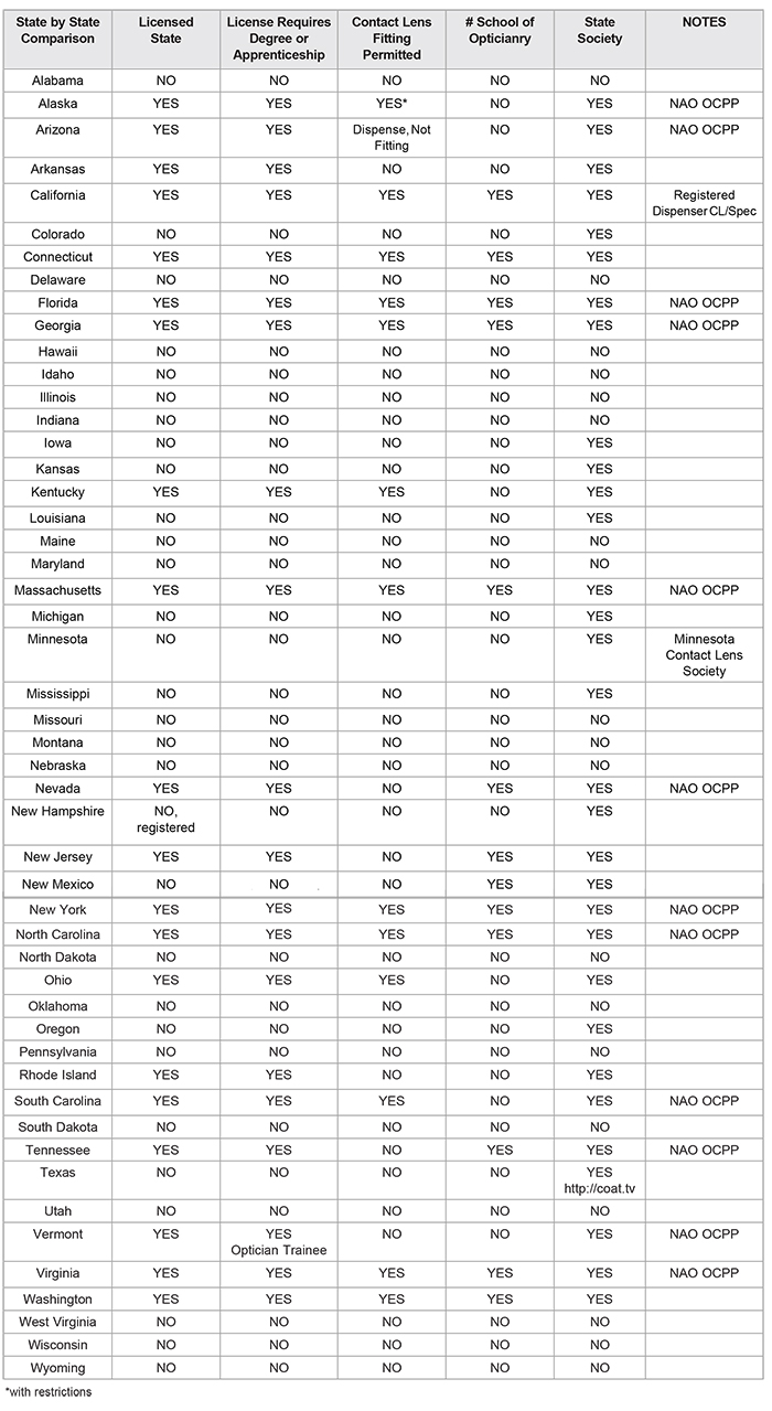 • Twenty-four percent of the states allow for contact lens fitting. Twenty-six percent do not allow the optician to fit contact lenses.