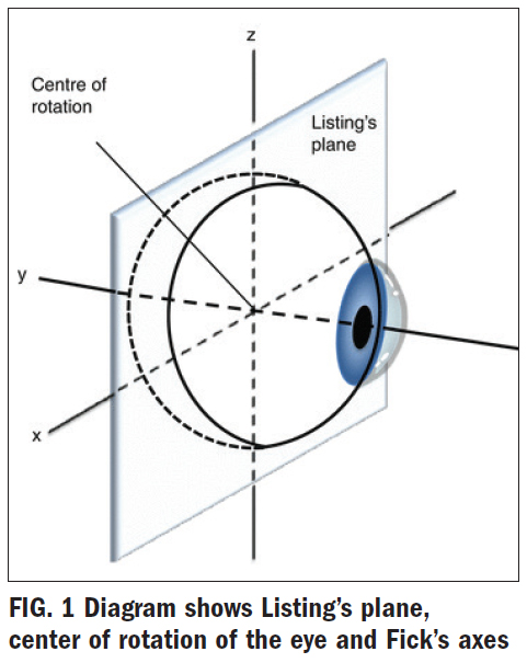 The six extraocular muscles rotate around a theoretical center of rotation. This is referred to as moving around the axes of Fick. There is something called Listing's Plane (Fig. 1), which is like an imaginary plane (picture a sheet of paper) that passes through the rotation center of the eye.