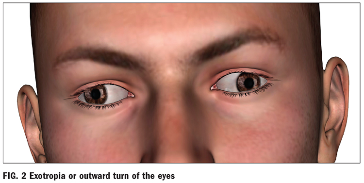 Ideally, the eyes work together binocularly; each eye forms an image on the retina of the same object in space and time. With good binocular vision, the brain fuses the two images together to form one clear image. When the eyes are properly aligned the eyes look and point in the same direction when looking at an object. When there is a misalignment, strabismus may be detected. When the eyes are misaligned, the individual may have strabismus, which is known as a squint. In this article, ocular misalignment will be referred to as strabismus. Deviations can be: EXO meaning outward (Fig. 2), ESO meaning inward, HYPER meaning upward and HYPO meaning downward.